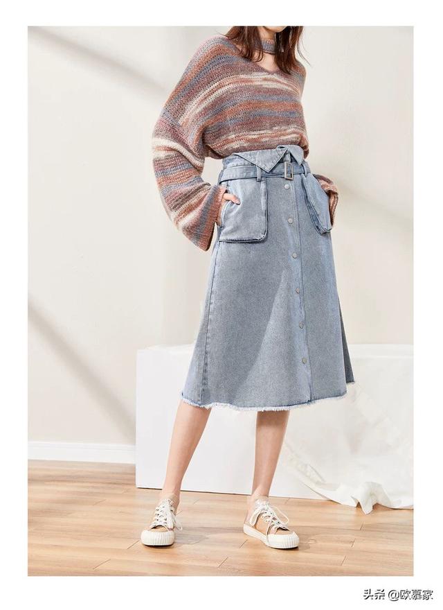 搭配一条蓝色的半身裙,裙角的开叉让你不会觉得迈不开步子。
