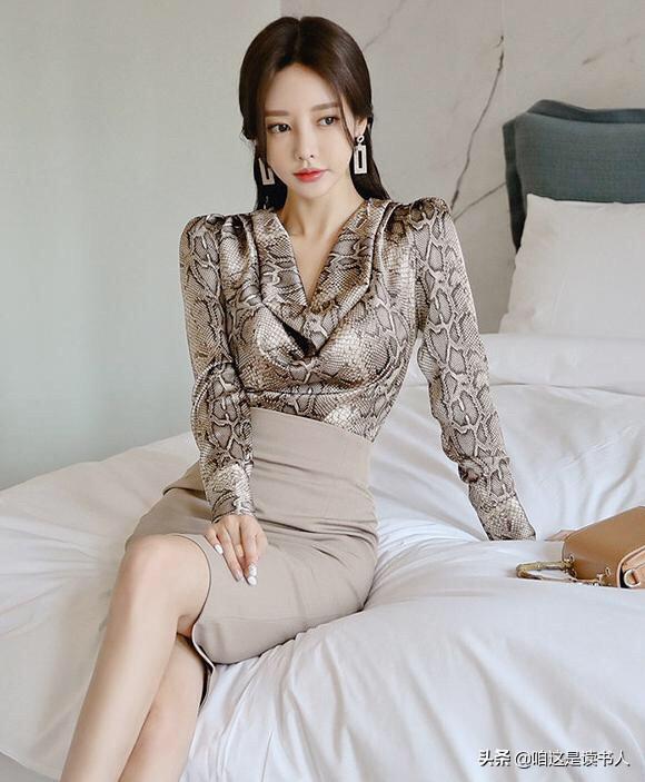 1、蛇纹V领长袖上衣,高腰基础半身裙