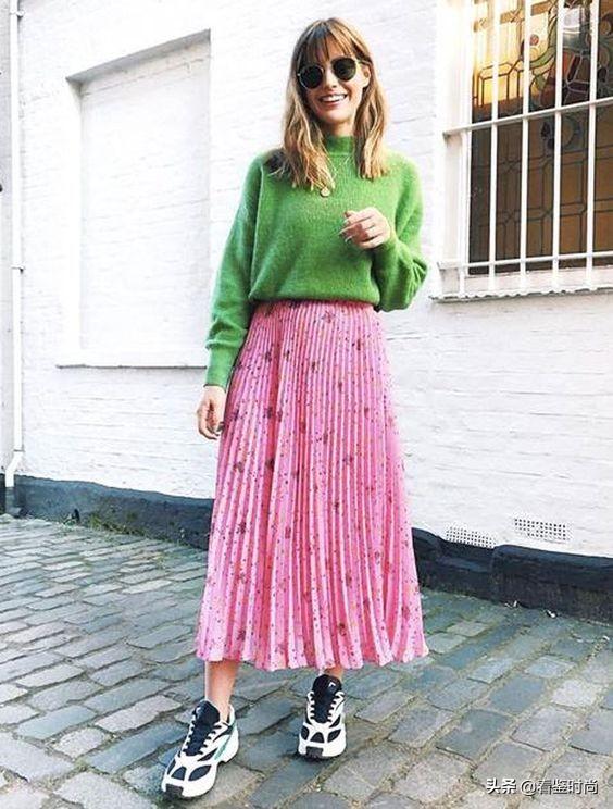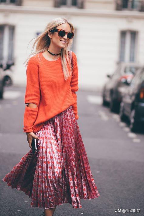 春天了,你可以大胆尝试鲜亮的流行色,比如说今年比较流行的橘红。裙子也可以选择褶裙,这样看上去更别致。