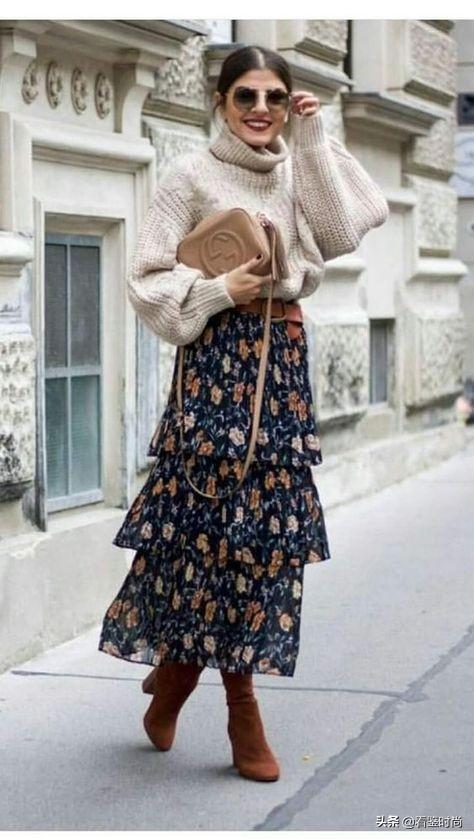 针织衫+碎花蛋糕裙+长筒靴