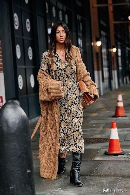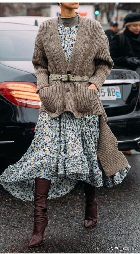 针织开衫和碎花连衣裙搭配真的也很不错,你可以选择将皮带束在毛衣外,也可以直接选择直接束在连衣裙上,同样选择搭配长筒靴,三种不同质感的材料形成丰富的对比,很有看头。