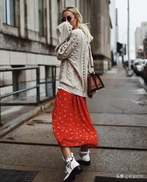 米色复古针织衫和红色碎花长裙搭配,效果真的也就非常复古,很有味道。